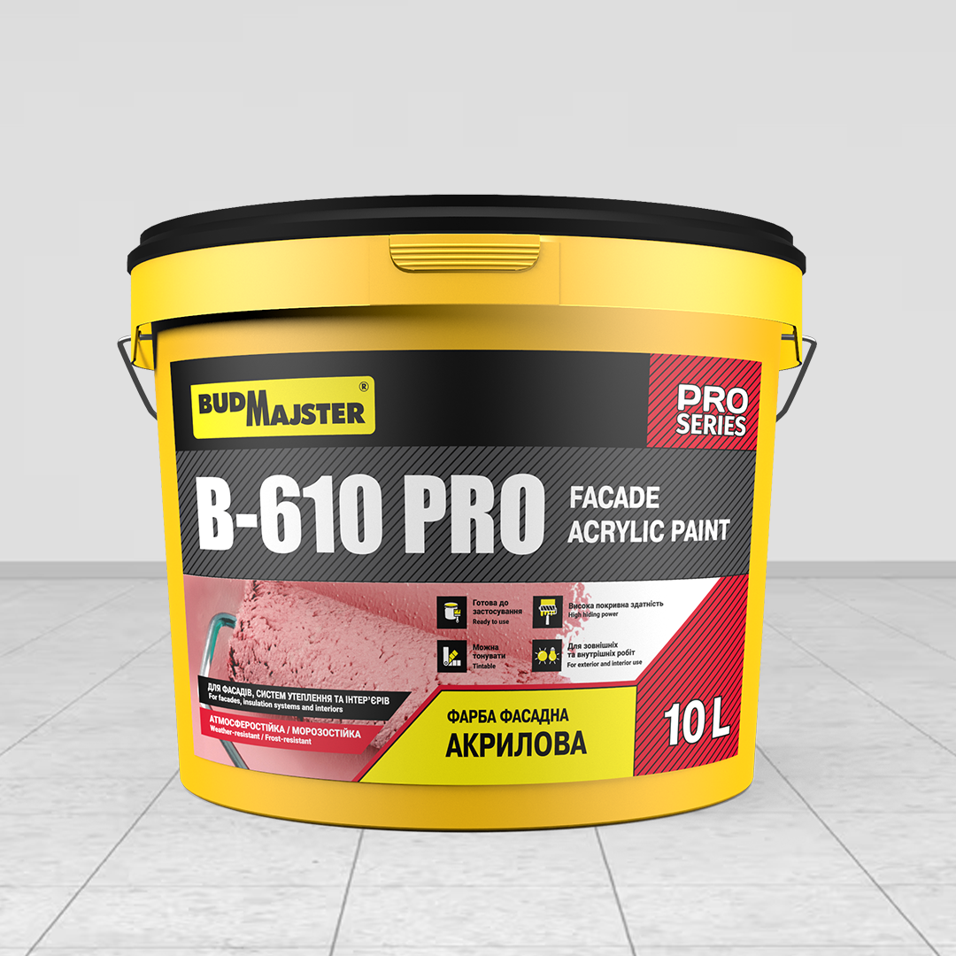 Акрилова фарба В-610 PRO призначена для фарбування стін та стель всередині та зовні будівель. Поверхня що фарбується може бути бетонною, цементною, цементно-вапняною, цегляною, гіпсовою або виконаною на основі деревини (ДВП, ДСП, МДФ та OSB), а також раніше пофарбованою водно-дисперсійними фарбами які допускають перефарбування. В-610 PRO застосовується як фінішне покриття в системах фасадної теплоізоляції з пінополістирольним утеплювачем.