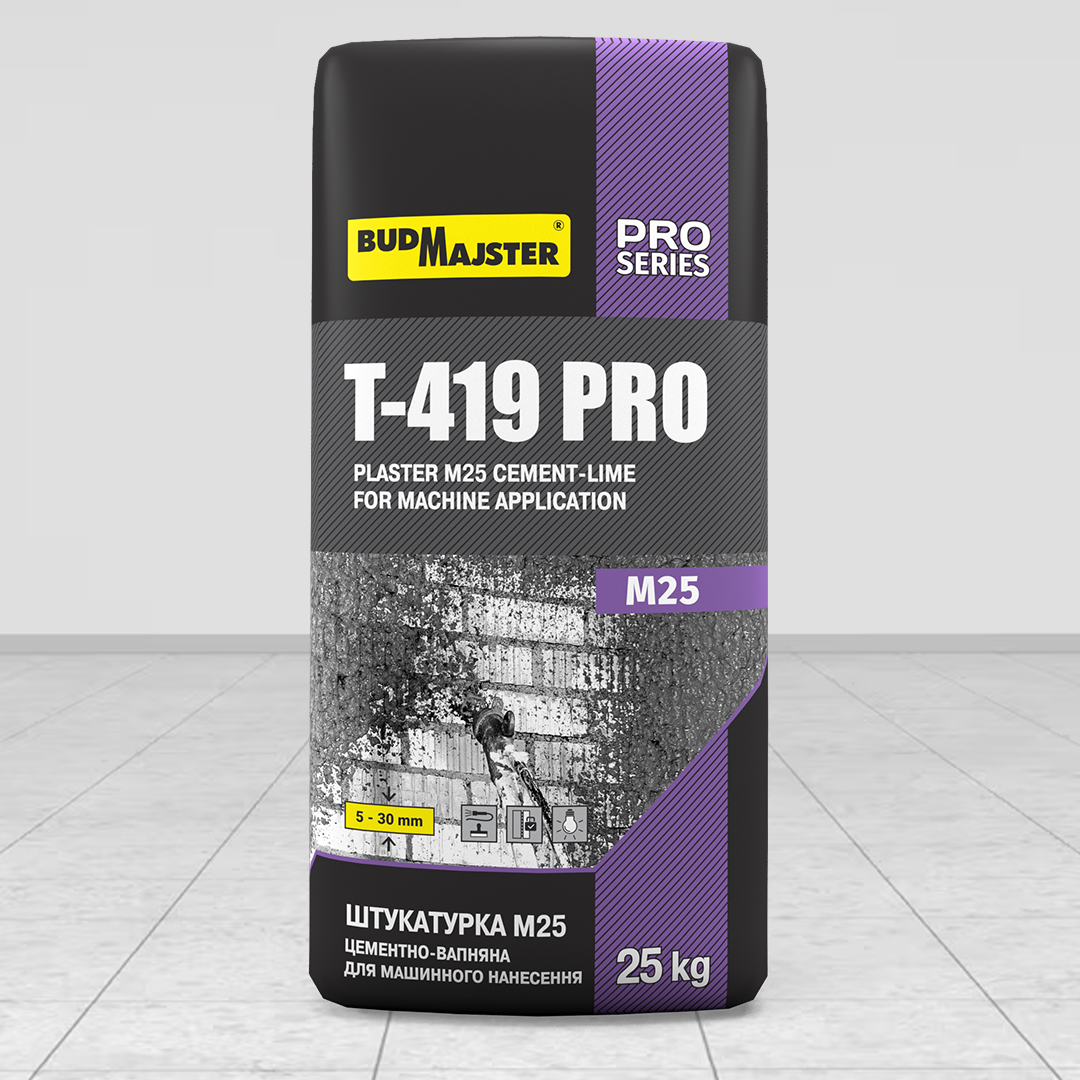 Штукатурка T-419 PRO призначена для механізованого високоякісного нанесення на цегляні, бетонні та інші мінеральні основи всередині будівель із застосуванням насосомішалок, проточних міксерів та штукатурних агрегатів. За необхідності допускається ручне нанесення. Склад формує рівномірне міцне покриття товщиною від 5 мм до 30 мм та дозволяє значно скоротити трудові витрати і терміни виконання опоряджувальних робіт.