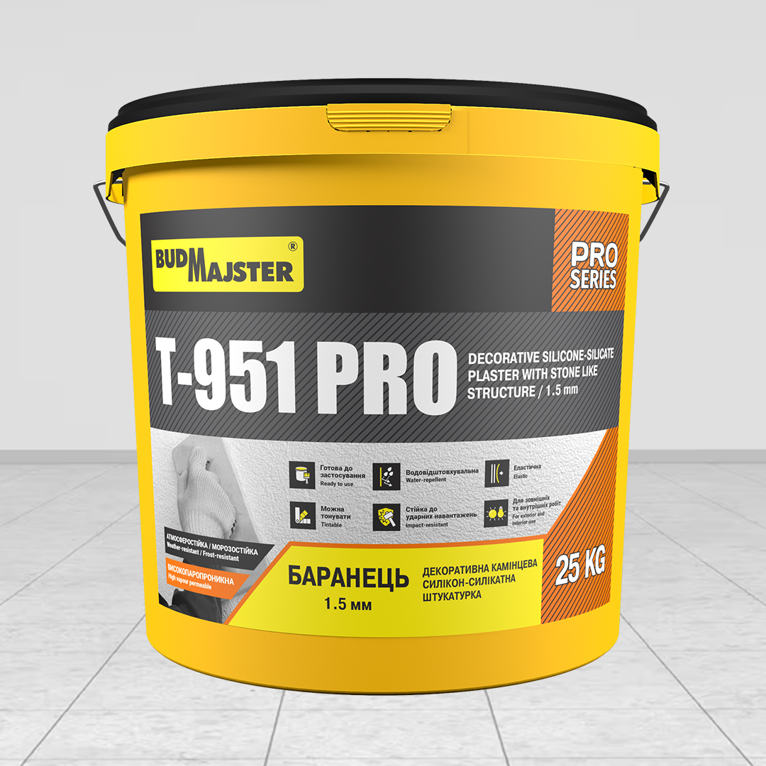 Штукатурка T-951 PRO застосовується для високоякісного декоративного оздоблення бетонних, цементних, цементно-вапняних, гіпсових, гіпсокартонних основ, плит виготовлених з деревени (ДСП, OSB тощо) усередині і зовні будинків та споруд. Також застосовується для улаштування декоративно-захисного шару в системах фасадної теплоізоляції в тому числі і у системах з мінераловатним утеплювачем. Можливе застосовування у приміщеннях, де потрібно зносостійке декоративне покриття стін: коридори, холи, сходові майданчики та клітини тощо.